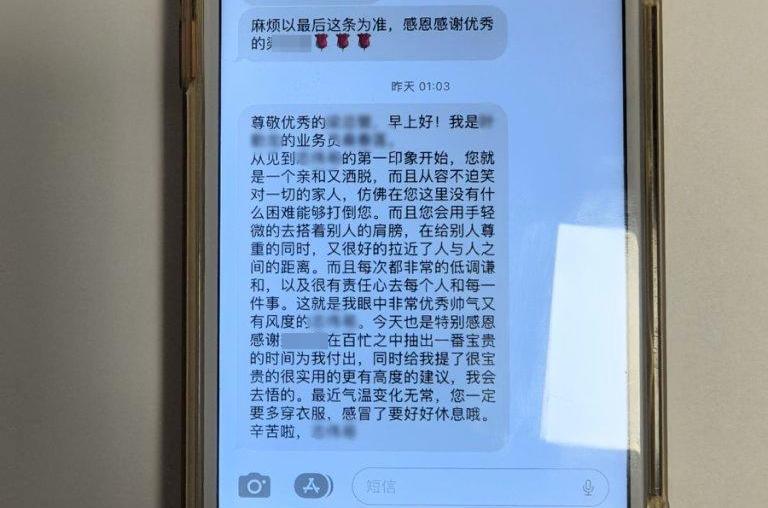 “从见到您的第一印象开始,您就是一个亲和又洒脱,而且从容不迫笑对一切的家人,仿佛在您这里没有什么困难能够打倒您……”这条充满温情的短信,就是该传销团伙拉人牟利的方式之一。
